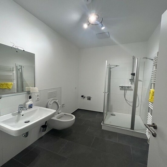 Das Badezimmer ist mit einer Badewanne und einer Dusche ausgestattet. Die hochwertige Glasdusche ist als „walkin“-Duschen gestaltet und somit barrierefrei.