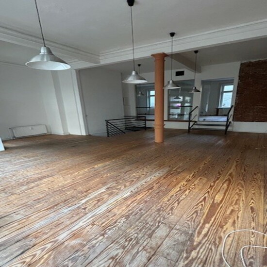 Zur Ausstattung gehören eine praktische Teeküche sowie zwei separate WCs, die den Komfort für Mitarbeiter und Kunden gleichermaßen erhöhen. Der Holzdielenfußboden verleiht den Räumlichkeiten eine warme und einladende Atmosphäre und unterstreicht den charmanten Charakter der Einheit.